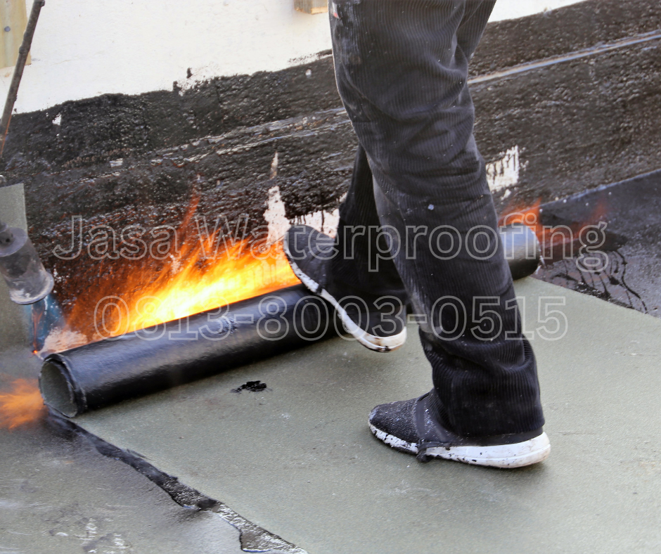 jenis pelapis anti bocor berbentuk lembaran bitumen yang diaplikasikan ke permukaan beton dengan cara dipanaskan menggunakan flame torch. Proses pemanasan ini membuat lembaran melekat kuat dan menyatu sempurna dengan permukaan atap, menciptakan lapisan kedap air yang tahan lama. Jenis waterproofing ini sangat cocok digunakan pada atap dak beton, rooftop, dan balkon terutama area dengan permukaan datar yang sering tergenang air dan terpapar langsung oleh panas matahari. - Waterproofing Polyurethane (PU Coating)
